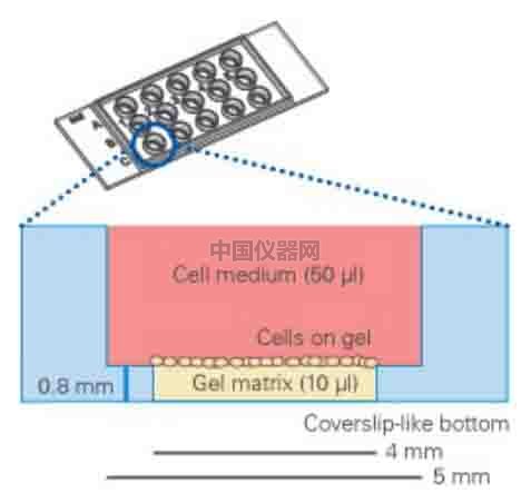 圖二 實驗流程圖 (提前將Matrigel融化,鋪于ibidi血管生成載玻片的下孔中,待膠凝后,將細胞懸液加入血管生成載玻片上孔中,成管后使用顯微鏡觀察。) 2.2耗材結構介紹