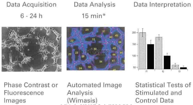 4、采集圖像并統計結果 可以按照細胞的生長速度定時采集圖像,并且對其成管長度,覆蓋面積,成環數,結點數進行測量和記錄,并且對其進行統計分析。