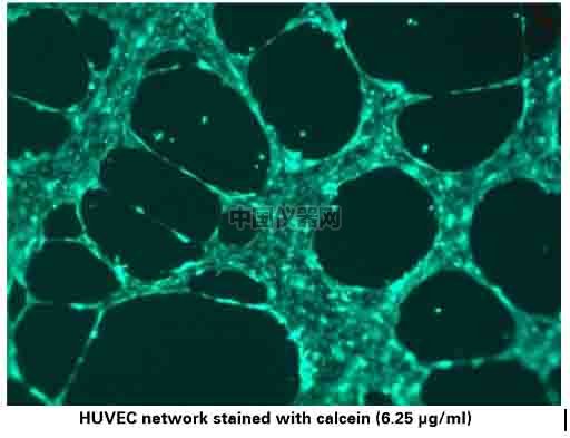 5、免疫熒光染色 根據需要,可以對成管結果進行免疫熒光染色。 小心的移除上孔內培養基,注意不要碰到膠或者細胞網絡。 加入50μl用無血清培養基稀釋的calcein (12.5 µl calcein stock 1 µg/µl),使其終濃度為 6.25 µg/ml (1:160)。 在室溫下避光孵育30分鐘。 使用PBS清洗三次,注意,PBS要緩緩加入上孔,以免沖擊掉細胞。 使用 485 nm/ 529 nm進行免疫熒光成像。