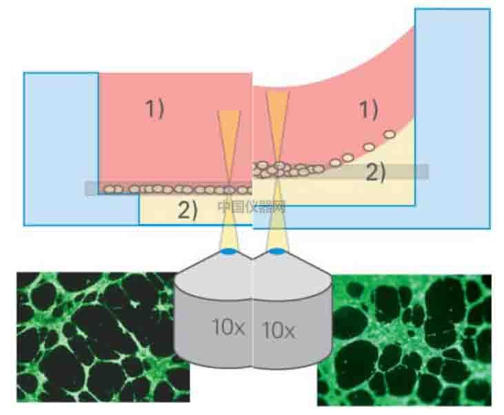 圖五 成像對比 (左側ibidi血管生成載玻片無凹液面,整個視野成像清晰;右側96孔板有凹液面,中間清晰周圍模糊。)