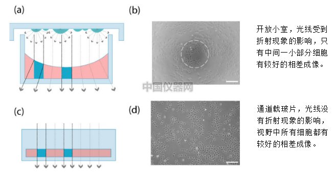 使用通道載玻片時,能在相差顯微鏡下獲得更好的成像效果。因為通道上下都是平坦的,不會因為凹液面的折射現象影響到相差顯微鏡成像。而well式的開放小室的相差成像會受到培養皿蓋和液面的折射現象影響。