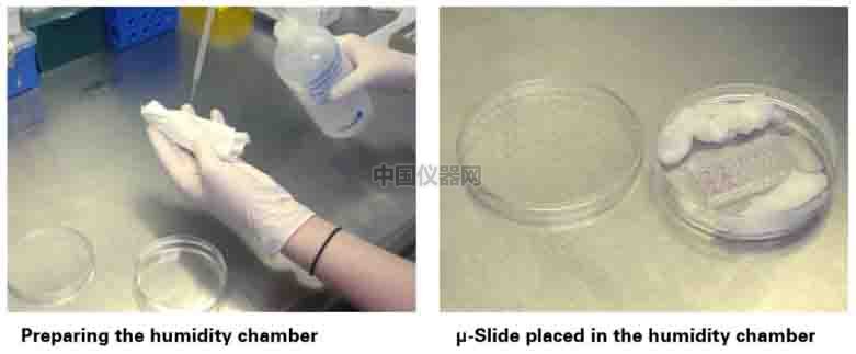 如上圖所示,垂直透過每個孔看下面的格子紙,如果格子被縮小了,那么就說明膠沒加滿,格子被放大了,那么膠就加多了,格子沒發生什么變形,這才是剛剛加滿下孔的狀態。 2)凝膠 ① 蓋上ibidi血管生成載玻片的蓋子。 ② 準備一個10cm的培養皿,放入浸過水的紙巾,制成一個濕盒。 ③ 將ibidi血管生成載玻片放入培養皿中,蓋上培養皿蓋。 ④ 將整個培養皿放入培養箱中,靜置30分鐘左右,等待膠凝結。 ⑤ 等待同時準備細胞懸液。