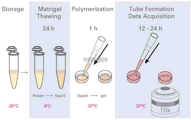 實驗流程圖,提前將Matrigel融化,鋪于ibidi血管生成載玻片 µSlide Angiogenesis 的下孔中,待膠凝后,將細胞懸液加入血管生成載玻片上孔中,成管后使用顯微鏡觀察。 (二)實驗步驟 1)準備基質膠 ① 實驗前一天將Matrigel置于冰盒中,放入4。C冰箱,使膠能過夜緩慢融化。(注意:同樣要準備一些4。C預冷的槍頭用于吸取Matrigel) ② 開始實驗前,將Matrigel始終保持放在冰盒中。 ③ 打開滅菌包裝,取出ibidi血光生成載玻片 µ-Slide Angiogenesis。 ④ 每孔中加入10μl Matrigel。注意槍頭要垂直于內孔的正上方加入Matrigel,防止有Matrigel流經上孔而留下殘留膠。