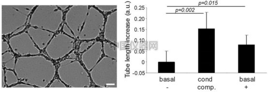 4)不同培養基處理 采用無處理基礎培養基(basal,-),培養了HMEC-124小時后收集的培養基(cond,comp.)和在基礎培養基中加入了分離出來的外分泌體的培養基(basal,+)分別加入血管生成載玻片中,37℃,培養18小時。 5)采集圖像并統計結果 可以按照細胞的生長速度定時采集圖像,并且對其成管長度測量和記錄,并且對其進行統計分析。 三)實驗結果